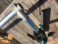 Taking the initiative of attaching the shaft beneath my office chair, I set about pulling an old bicycle maintenance stand, apart. The clamp would attach, I could then use my appalling welding skills to attach additional bits. The parts I used, were: